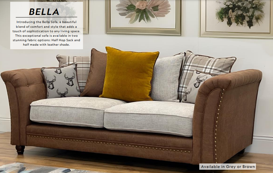 Introducing the Bella Sofa, a beautiful blend of comfort and style that adds a touch of sophistication to any living space. This exceptional sofa is available in two stunning fabric options: Half Hop Sack and half made with leather shade.