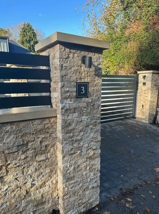 Rustic travertine split face cladding comes in a 30.5 x 30.5cm sheet size, 15mm thickness and each individual piece of travertine is 5 x 10cm in size.