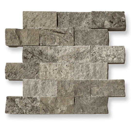 Beautiful silver travertine split face mosaic sheets are perfect for a feature wall in a living room, kitchen or bathroom. This material provides a wonderful textured natural stone finish. This material can also be used as cladding on external walls.