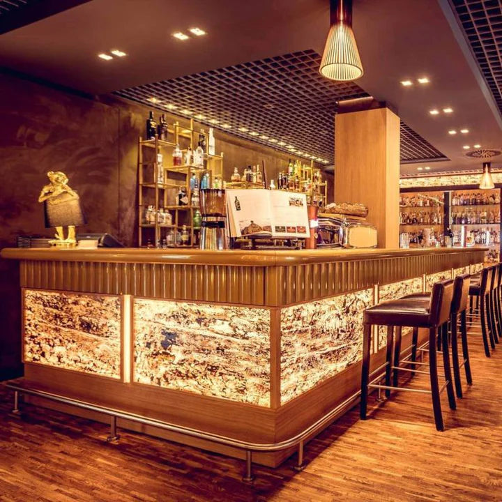 Our slate veneer translucent sheets are installed by adhering the sheets to a sheet of transparent acrylic or Perspex. Our slate veneers are fixed to the Perspex using a transparent MS polymer adhesive such as Soudal crystal clear. The sheets can then be back lit using LED light sheets or a similar light source. They are regularly used for bar and counter cladding, feature walls, signage and lighting features.