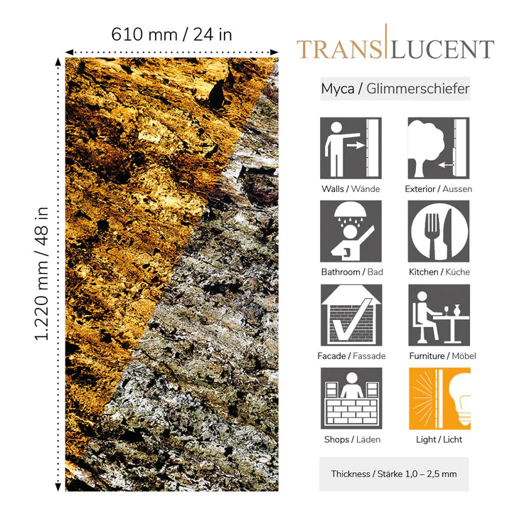 This stunning translucent Caldera Gold Slate Veneer sheet has a 100% natural stone face specially manufactured with a fibre glass and transparent resin backing to make it flexible, light weight and easy to install.