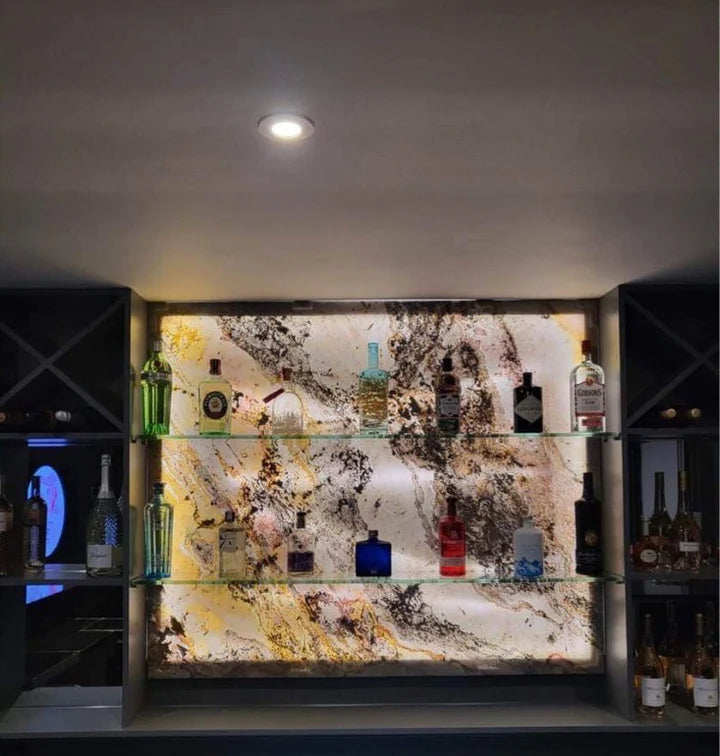 Our slate veneer translucent sheets are installed by adhering the sheets to a sheet of transparent acrylic or Perspex. Our slate veneers are fixed to the Perspex using a transparent MS polymer adhesive such as Soudal crystal clear. The sheets can then be back lit using LED light sheets or a similar light source. They are regularly used for bar and counter cladding, feature walls, signage and lighting features.