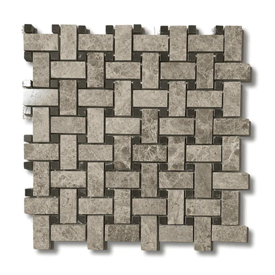 Silver Shadow marble basket weave mosaics comes in a 30.5 x 30.5cm sheet size and are 1cm thickness. The basket weave pattern includes Nero Marquina black marble inserts.