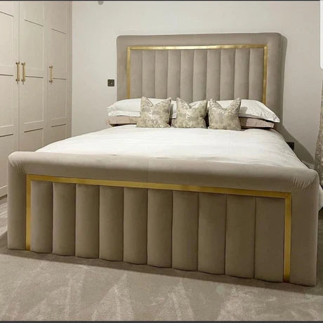 The Bed is handmade and upholstered in the beautiful Lined design. Providing you quality at an affordable price. Strong solid slatted base to provide longevity for your mattress and allowing you to enjoy a beautiful night's sleep. Handcrafted in the UK with the most luxurious fabric.