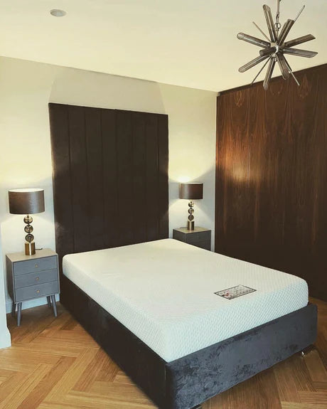 The Bed is handmade and upholstered in the beautiful Madison Panel Line design. Providing you quality at an affordable price. Strong solid slatted base to provide longevity for your mattress and allowing you to enjoy a beautiful night's sleep. Handcrafted in the UK with the most luxurious fabric.