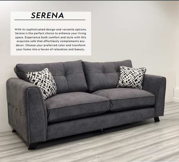 With its sophisticated design and versatile options, Serena is the perfect choice to enhance your living space. Experience both comfort and style with this exquisite sofa that effortlessly complements any décor. Choose your preferred color and transform your home into a haven of relaxation and beauty