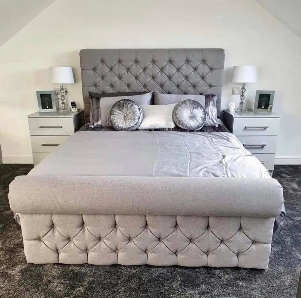 The Bed is handmade and upholstered in the beautiful Lined design. Providing you quality at an affordable price. Strong solid slatted base to provide longevity for your mattress and allowing you to enjoy a beautiful night's sleep. Handcrafted in the UK with the most luxurious fabric.
