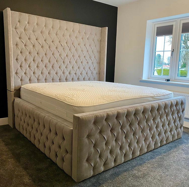 The Bed is handmade and upholstered in the beautiful Lined design. Providing you quality at an affordable price. Strong solid slatted base to provide longevity for your mattress and allowing you to enjoy a beautiful night's sleep. Handcrafted in the UK with the most luxurious fabric.