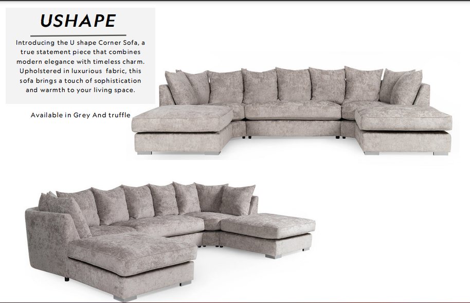 Introducing the U shape Corner Sofa, a true statement piece that combines modern elegance with timeless charm. Upholstered in luxurious fabric, this sofa brings a touch of sophistication and warmth to your living space. Available in Grey And truffle